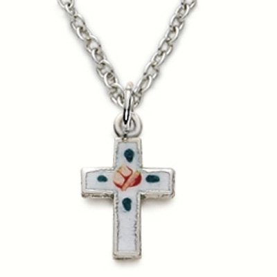 3/8" Sterling Silver Cross Necklace with White and Rose Enamel on 18" Chain